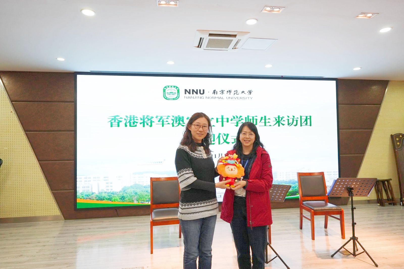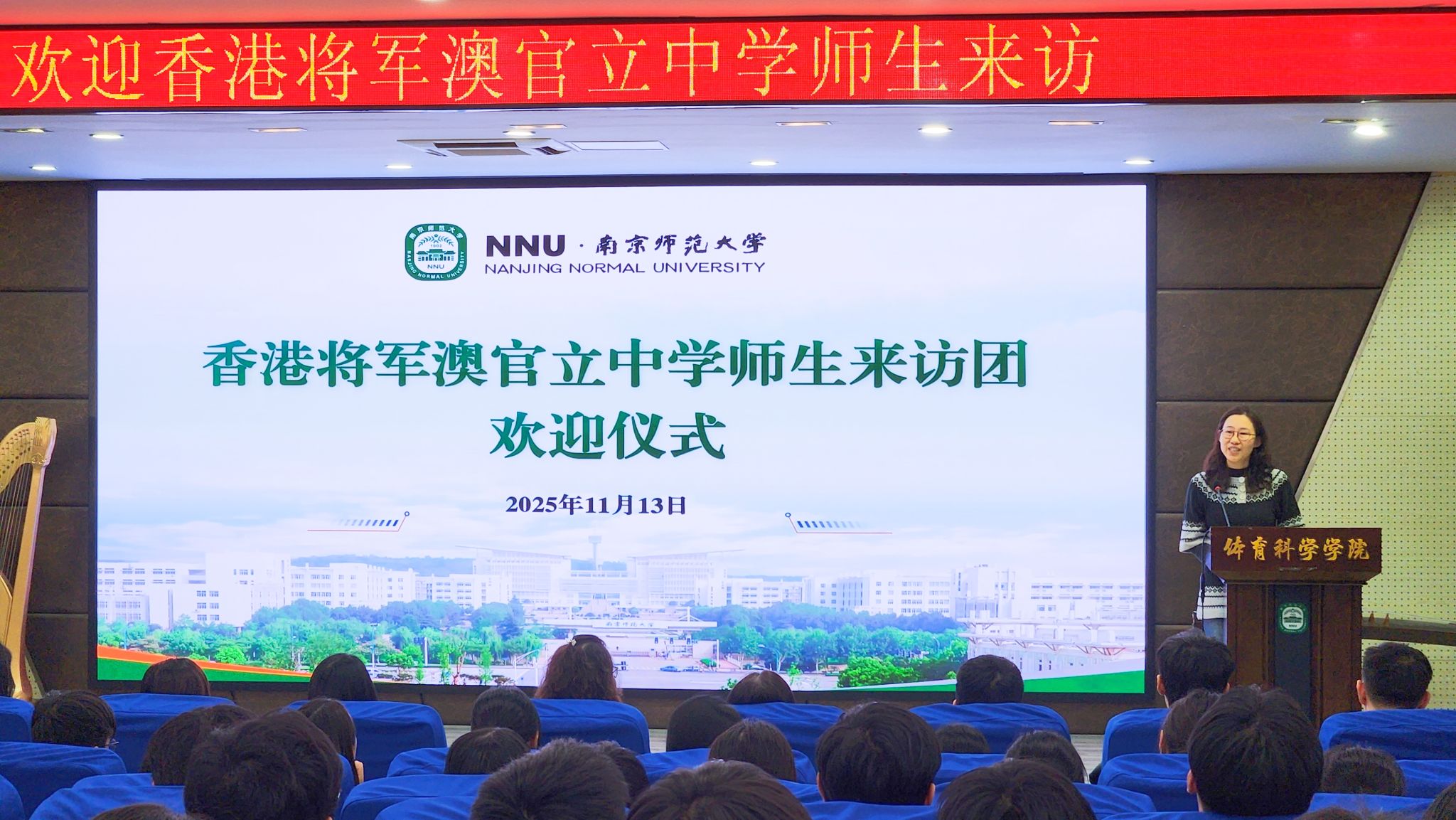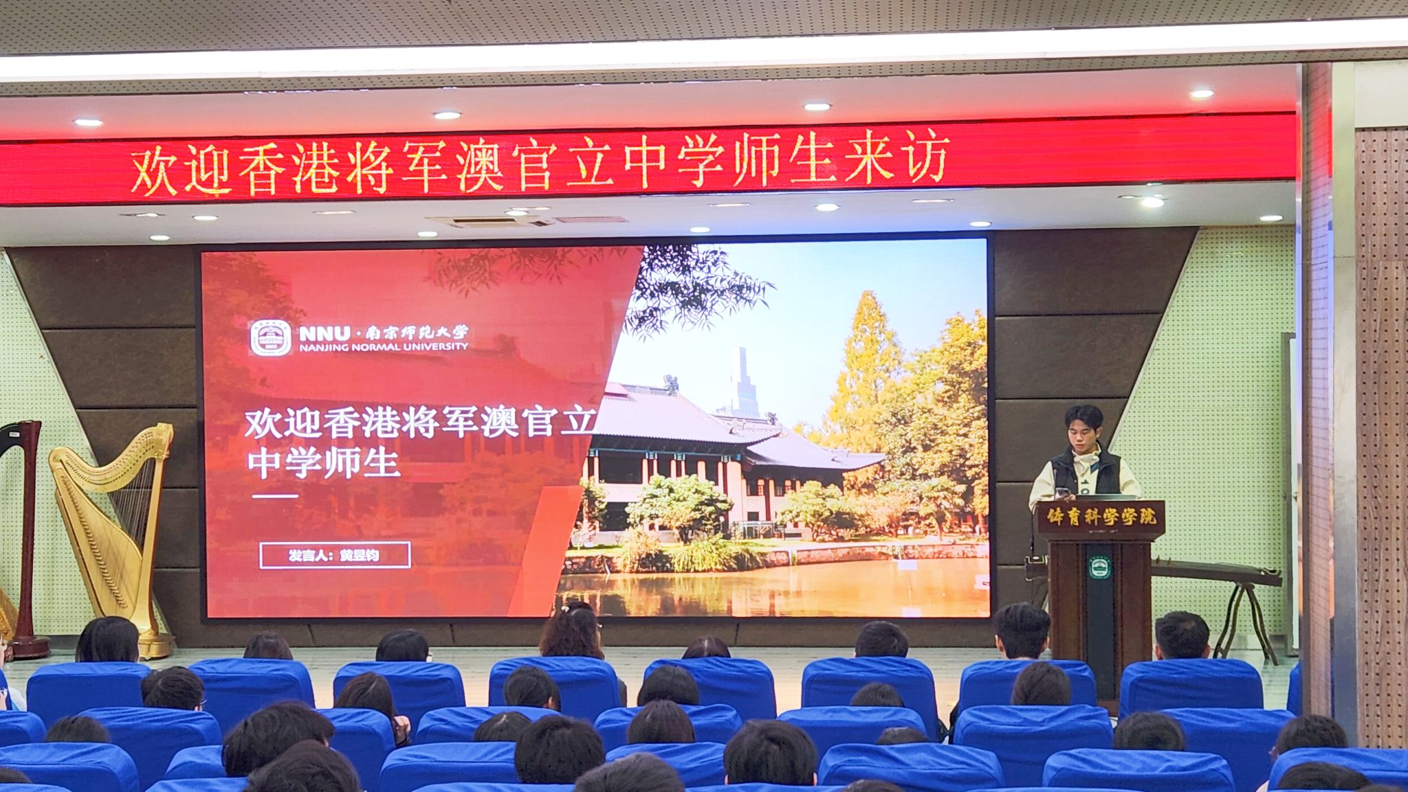 欢迎仪式在仙林校区举行,校港澳台事务办公室副主任蔡能致欢迎辞。她首先介绍了南京师范大学的办学历史,阐述了学校优势学科、特色专业方面的发展情况。还特别提到南师大与香港在教育合作方面的成果,今年,已累计接待香港中学生交流团超400人次;作为苏港澳高校合作联盟的副理事长和秘书处单位,南师大一直积极投身联盟建设,与香港多所高校建立常态化合作机制。此外,她还简要介绍了我校面向香港学生的本科招生政策,表示学校一直高度重视港澳台地区学生的招生及培养工作,全力为港澳台学生营造优质的教育环境,提供多元化的实践与活动机会,欢迎将军澳官立中学的优秀学子报考南师大。在欢迎仪式上,南师大香港学生代表黄昱均真诚分享了自己在南京的学习和生活经历。
