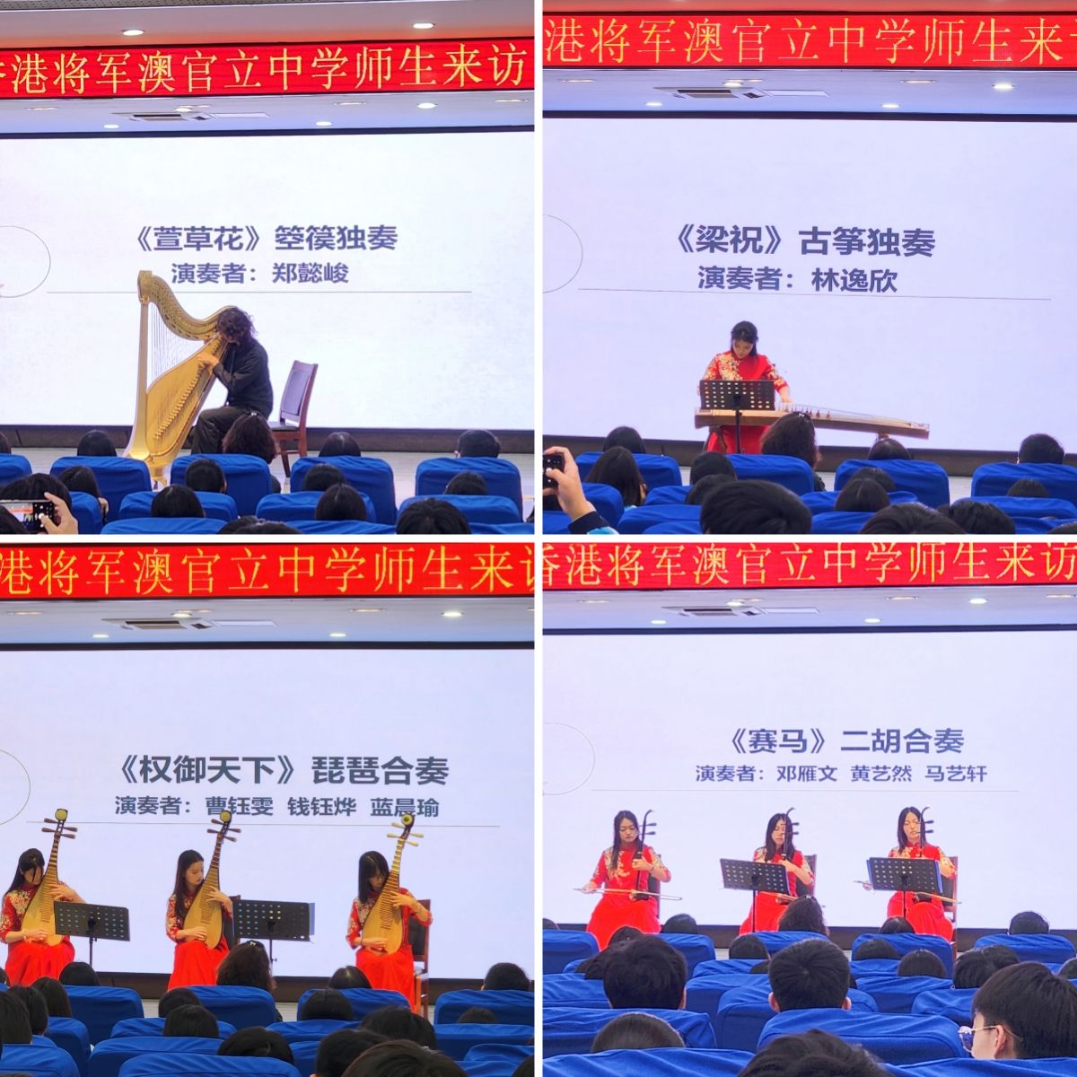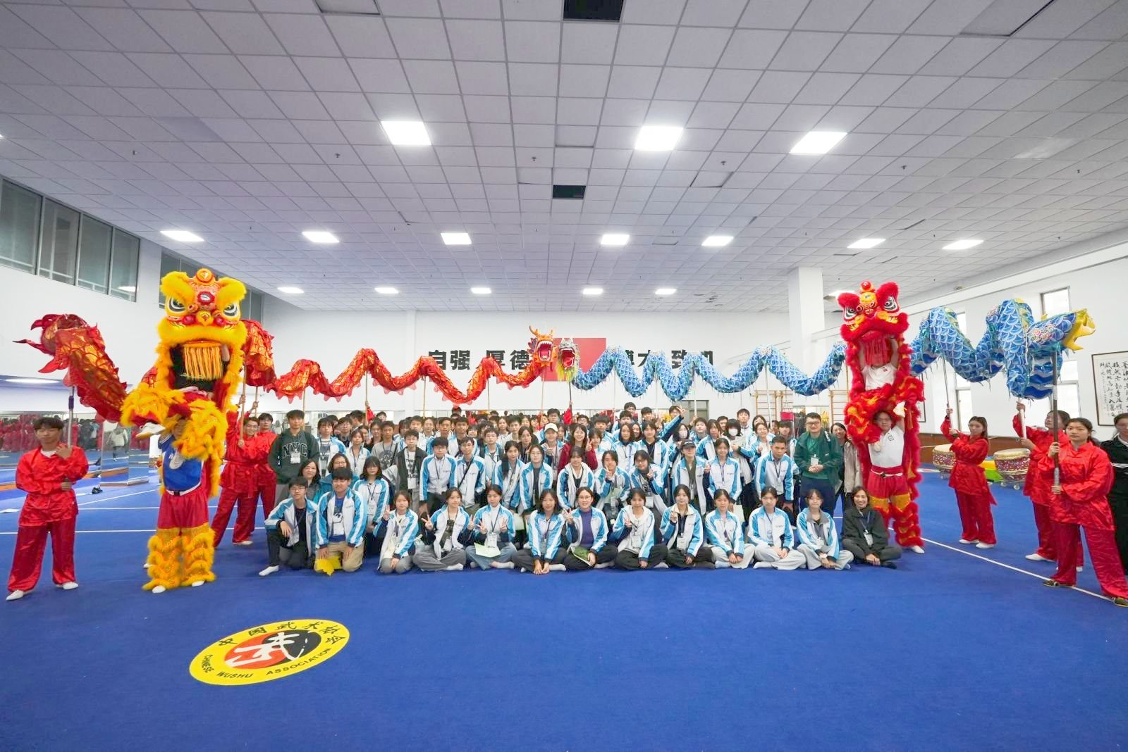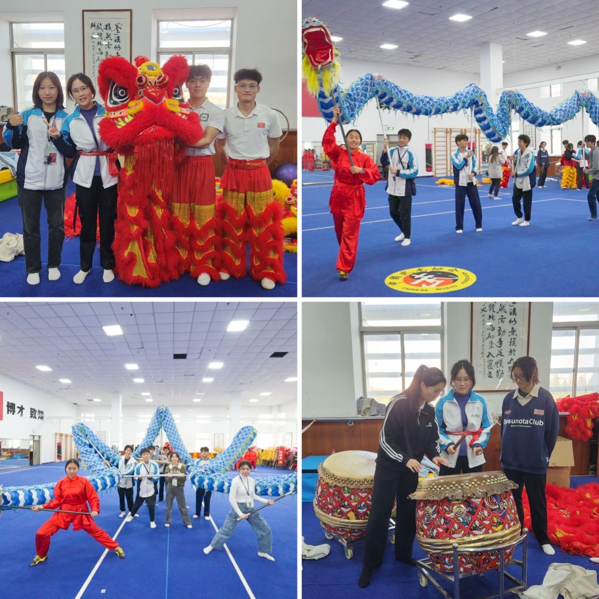 欢迎仪式结束后,访问团欣赏了由我校美育中心民乐团演奏的《萱草花》《梁祝》等曲目。乐团以箜篌、古筝、琵琶等传统乐器演绎经典曲目,细腻婉转的演绎赢得师生阵阵掌声。在体育中心,访问团成员还欣赏了由我校体科院学生带来舞龙舞狮表演。锣鼓声骤响,龙身如行云流水般穿梭游走,时而化作波浪起伏,时而盘成圆环蓄势,雄狮抖擞,震足生威。在体科院师生的悉心指导下,香港学生纷纷踊跃参与,亲自体验了舞龙舞狮的基本功,感受这一传统技艺的独特魅力。
